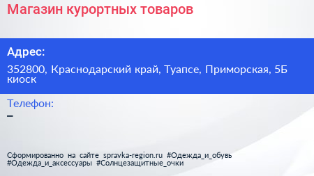 Магазин курортных товаров по адресу 352800, Краснодарский край, Туапсе, Приморская, 5Б киоск в дальнейшем Организация, размещена в следующих категориях:
