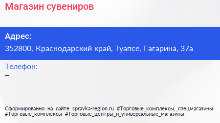 Магазин сувениров по адресу 352800, Краснодарский край, Туапсе, Гагарина, 37а в дальнейшем Организация, размещена в следующих категориях: