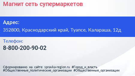 Магнит, сеть супермаркетов по адресу 352800, Краснодарский край, Туапсе, Калараша, 12д в дальнейшем Организация, размещена в следующих категориях: