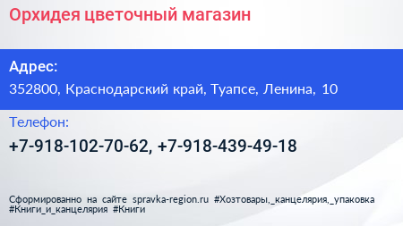 Орхидея, цветочный магазин по адресу 352800, Краснодарский край, Туапсе, Ленина, 10 в дальнейшем Организация, размещена в следующих категориях: