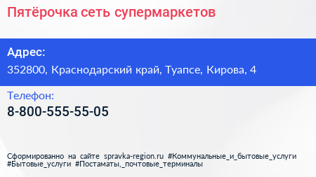 Пятёрочка, сеть супермаркетов по адресу 352800, Краснодарский край, Туапсе, Кирова, 4 в дальнейшем Организация, размещена в следующих категориях: