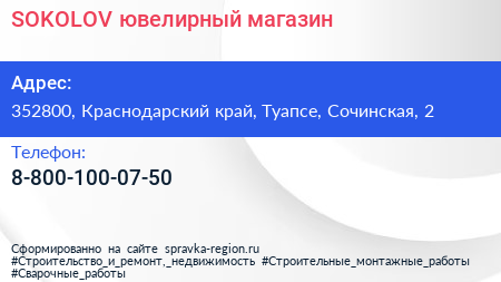 SOKOLOV, ювелирный магазин по адресу 352800, Краснодарский край, Туапсе, Сочинская, 2 в дальнейшем Организация, размещена в следующих категориях: