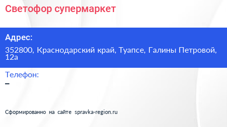 Светофор, супермаркет по адресу 352800, Краснодарский край, Туапсе, Галины Петровой, 12а в дальнейшем Организация, размещена в следующих категориях: