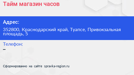 Тайм, магазин часов по адресу 352800, Краснодарский край, Туапсе, Привокзальная площадь, 5 в дальнейшем Организация, размещена в следующих категориях: