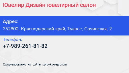 Ювелир-Дизайн, ювелирный салон по адресу 352800, Краснодарский край, Туапсе, Сочинская, 2 в дальнейшем Организация, размещена в следующих категориях: