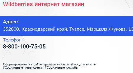 Wildberries, интернет-магазин по адресу 352800, Краснодарский край, Туапсе, Маршала Жукова, 13 в дальнейшем Организация, размещена в следующих категориях: