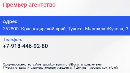 Премьер, агентство по адресу 352800, Краснодарский край, Туапсе, Маршала Жукова, 3 в дальнейшем Организация, размещена в следующих категориях: