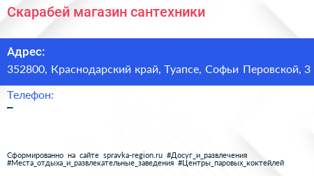 Скарабей, магазин сантехники по адресу 352800, Краснодарский край, Туапсе, Софьи Перовской, 3 в дальнейшем Организация, размещена в следующих категориях: