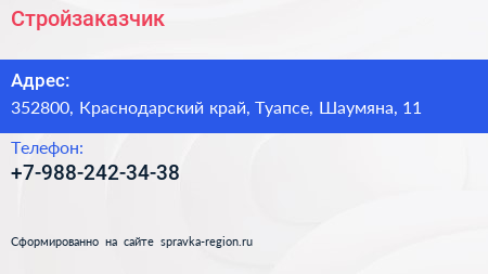 Стройзаказчик по адресу 352800, Краснодарский край, Туапсе, Шаумяна, 11 в дальнейшем Организация, размещена в следующих категориях: