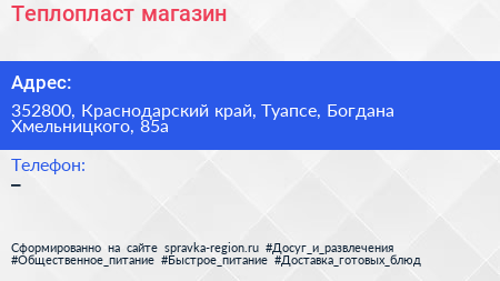 Теплопласт, магазин по адресу 352800, Краснодарский край, Туапсе, Богдана Хмельницкого, 85а в дальнейшем Организация, размещена в следующих категориях: