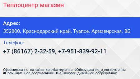 Теплоцентр, магазин по адресу 352800, Краснодарский край, Туапсе, Армавирская, 8Б в дальнейшем Организация, размещена в следующих категориях: