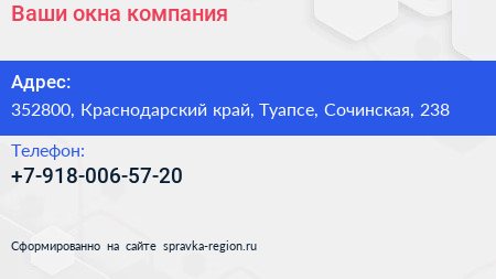 Ваши окна, компания по адресу 352800, Краснодарский край, Туапсе, Сочинская, 238 в дальнейшем Организация, размещена в следующих категориях: