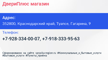 ДвериПлюс, магазин по адресу 352800, Краснодарский край, Туапсе, Гагарина, 9 в дальнейшем Организация, размещена в следующих категориях: