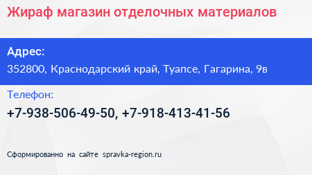 Жираф, магазин отделочных материалов по адресу 352800, Краснодарский край, Туапсе, Гагарина, 9в в дальнейшем Организация, размещена в следующих категориях: