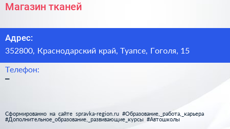 Магазин тканей по адресу 352800, Краснодарский край, Туапсе, Гоголя, 15 в дальнейшем Организация, размещена в следующих категориях: