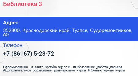 Библиотека №3 по адресу 352800, Краснодарский край, Туапсе, Судоремонтников, 60 в дальнейшем Организация, размещена в следующих категориях: