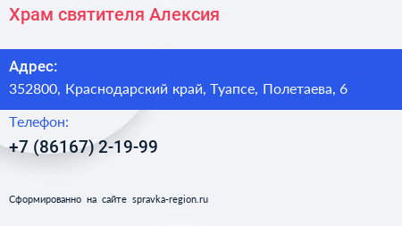 Храм святителя Алексия по адресу 352800, Краснодарский край, Туапсе, Полетаева, 6 в дальнейшем Организация, размещена в следующих категориях: