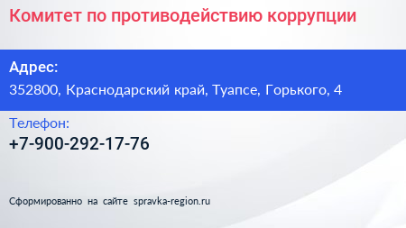Комитет по противодействию коррупции по адресу 352800, Краснодарский край, Туапсе, Горького, 4 в дальнейшем Организация, размещена в следующих категориях: