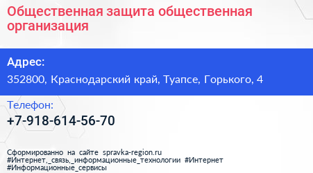 Общественная защита, общественная организация по адресу 352800, Краснодарский край, Туапсе, Горького, 4 в дальнейшем Организация, размещена в следующих категориях: