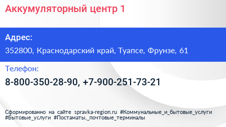 Аккумуляторный центр №1 по адресу 352800, Краснодарский край, Туапсе, Фрунзе, 61 в дальнейшем Организация, размещена в следующих категориях: