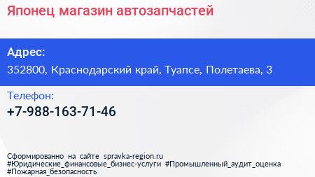 Японец, магазин автозапчастей по адресу 352800, Краснодарский край, Туапсе, Полетаева, 3 в дальнейшем Организация, размещена в следующих категориях: