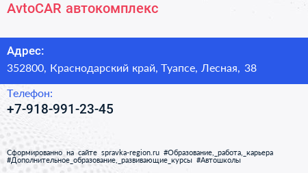 AvtoCAR, автокомплекс по адресу 352800, Краснодарский край, Туапсе, Лесная, 38 в дальнейшем Организация, размещена в следующих категориях: