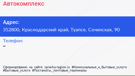 Автокомплекс по адресу 352800, Краснодарский край, Туапсе, Сочинская, 90 в дальнейшем Организация, размещена в следующих категориях: