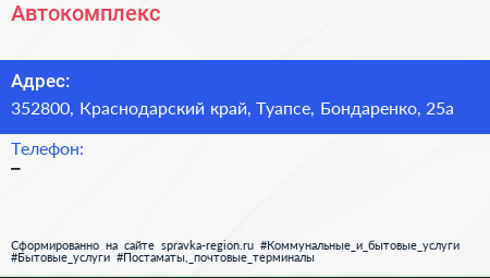 Автокомплекс по адресу 352800, Краснодарский край, Туапсе, Бондаренко, 25а в дальнейшем Организация, размещена в следующих категориях: