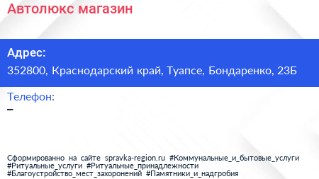 Автолюкс, магазин по адресу 352800, Краснодарский край, Туапсе, Бондаренко, 23Б в дальнейшем Организация, размещена в следующих категориях: