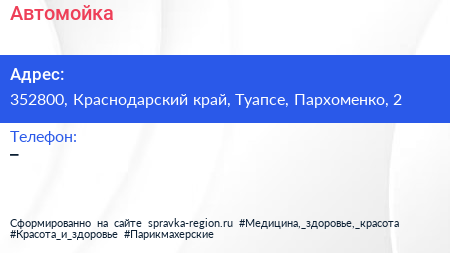 Автомойка по адресу 352800, Краснодарский край, Туапсе, Пархоменко, 2 в дальнейшем Организация, размещена в следующих категориях: