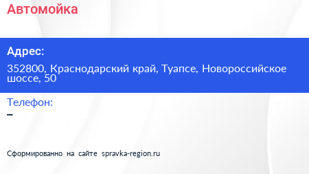 Автомойка по адресу 352800, Краснодарский край, Туапсе, Новороссийское шоссе, 50 в дальнейшем Организация, размещена в следующих категориях: