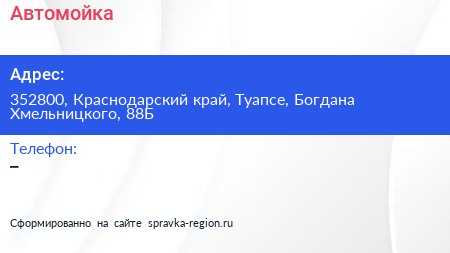 Автомойка по адресу 352800, Краснодарский край, Туапсе, Богдана Хмельницкого, 88Б в дальнейшем Организация, размещена в следующих категориях: