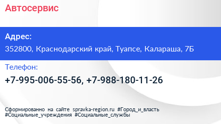 Автосервис по адресу 352800, Краснодарский край, Туапсе, Калараша, 7Б в дальнейшем Организация, размещена в следующих категориях: