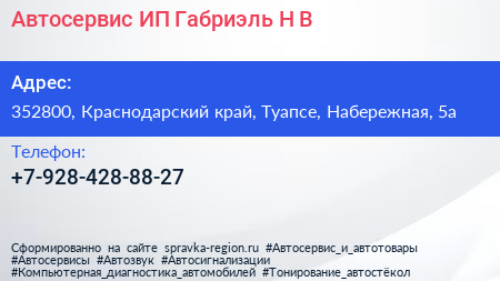 Автосервис, ИП Габриэль Н.В. по адресу 352800, Краснодарский край, Туапсе, Набережная, 5а в дальнейшем Организация, размещена в следующих категориях: