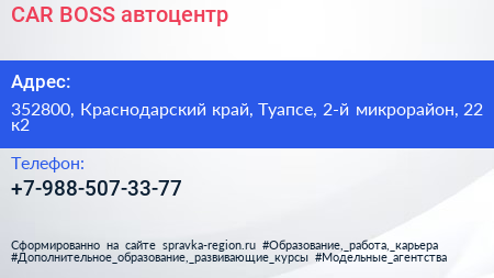 CAR BOSS, автоцентр по адресу 352800, Краснодарский край, Туапсе, 2-й микрорайон, 22 к2 в дальнейшем Организация, размещена в следующих категориях: