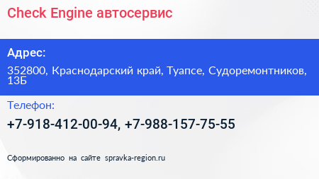 Check Engine, автосервис по адресу 352800, Краснодарский край, Туапсе, Судоремонтников, 13Б в дальнейшем Организация, размещена в следующих категориях:
