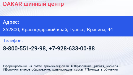 DAKAR, шинный центр по адресу 352800, Краснодарский край, Туапсе, Красина, 44 в дальнейшем Организация, размещена в следующих категориях: