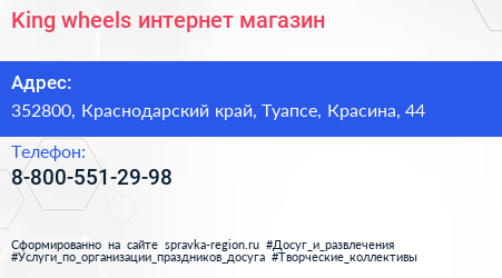 King-wheels, интернет-магазин по адресу 352800, Краснодарский край, Туапсе, Красина, 44 в дальнейшем Организация, размещена в следующих категориях: