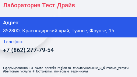 Лаборатория Тест-Драйв по адресу 352800, Краснодарский край, Туапсе, Фрунзе, 15 в дальнейшем Организация, размещена в следующих категориях:
