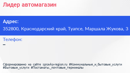 Лидер, автомагазин по адресу 352800, Краснодарский край, Туапсе, Маршала Жукова, 3 в дальнейшем Организация, размещена в следующих категориях: