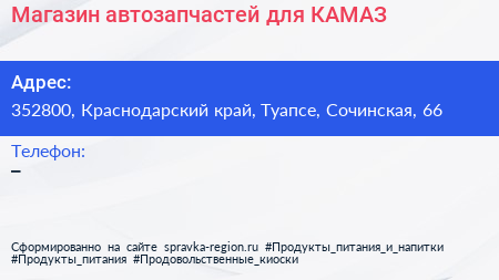 Магазин автозапчастей для КАМАЗ по адресу 352800, Краснодарский край, Туапсе, Сочинская, 66 в дальнейшем Организация, размещена в следующих категориях: