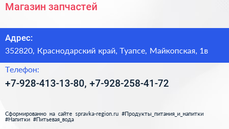 Магазин запчастей по адресу 352820, Краснодарский край, Туапсе, Майкопская, 1в в дальнейшем Организация, размещена в следующих категориях:
