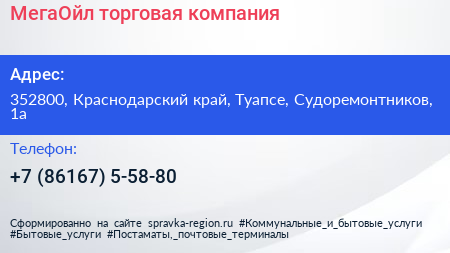 МегаОйл, торговая компания по адресу 352800, Краснодарский край, Туапсе, Судоремонтников, 1а в дальнейшем Организация, размещена в следующих категориях: