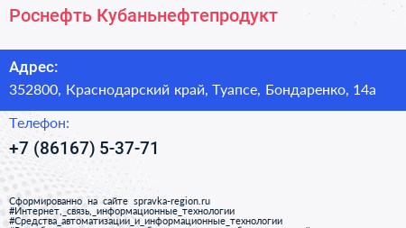 Роснефть-Кубаньнефтепродукт по адресу 352800, Краснодарский край, Туапсе, Бондаренко, 14а в дальнейшем Организация, размещена в следующих категориях: