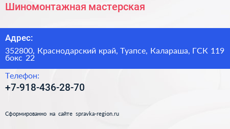 Шиномонтажная мастерская по адресу 352800, Краснодарский край, Туапсе, Калараша, ГСК 119 бокс 22 в дальнейшем Организация, размещена в следующих категориях: