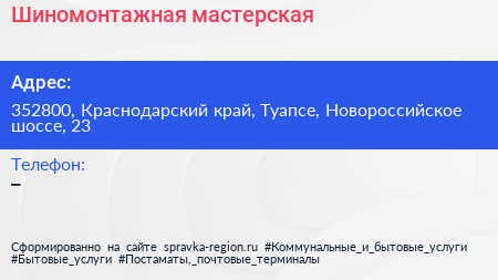 Шиномонтажная мастерская по адресу 352800, Краснодарский край, Туапсе, Новороссийское шоссе, 23 в дальнейшем Организация, размещена в следующих категориях: