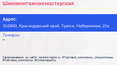 Шиномонтажная мастерская по адресу 352800, Краснодарский край, Туапсе, Набережная, 25а в дальнейшем Организация, размещена в следующих категориях: