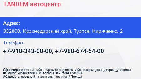 TANDEM, автоцентр по адресу 352800, Краснодарский край, Туапсе, Кириченко, 2 в дальнейшем Организация, размещена в следующих категориях: