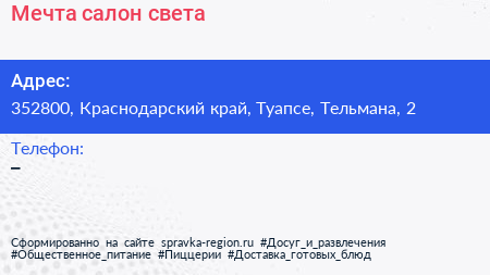 Мечта, салон света по адресу 352800, Краснодарский край, Туапсе, Тельмана, 2 в дальнейшем Организация, размещена в следующих категориях: