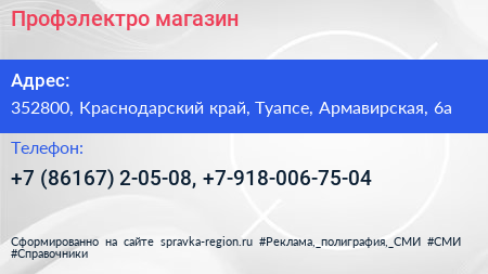 Профэлектро, магазин по адресу 352800, Краснодарский край, Туапсе, Армавирская, 6а в дальнейшем Организация, размещена в следующих категориях: